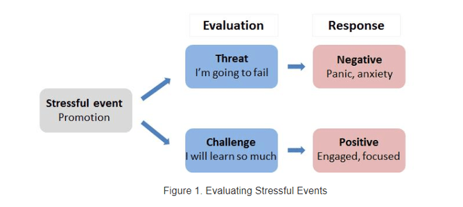 Stress refers to the way we evaluate and cope with threats and challenges in our environment. Interestingly, stress is caused more by the way we evaluate or perceive threats than the threats themselves. For example, a promotion at work may be seen by some individuals as an exciting opportunity; whilst others may be overwhelmed by a fear of failure in their new role (see Figure 1 below). When we perceive stressful events as a challenge, these stressors can motivate us to work a little harder and are largely positive. However, when we see threat as a negative, a variety of adverse consequences can occur (e.g. panic, anxiety etc.).
